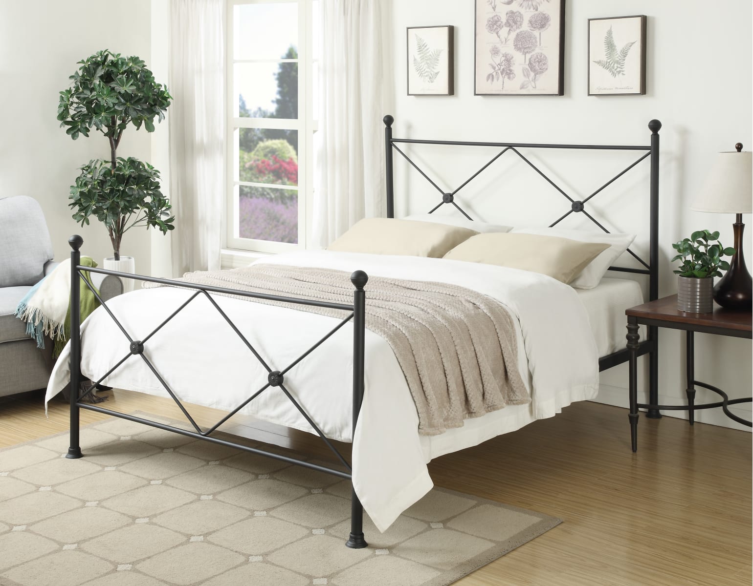 - Post style headboard and footboard with finials feature a simple "X" design motif