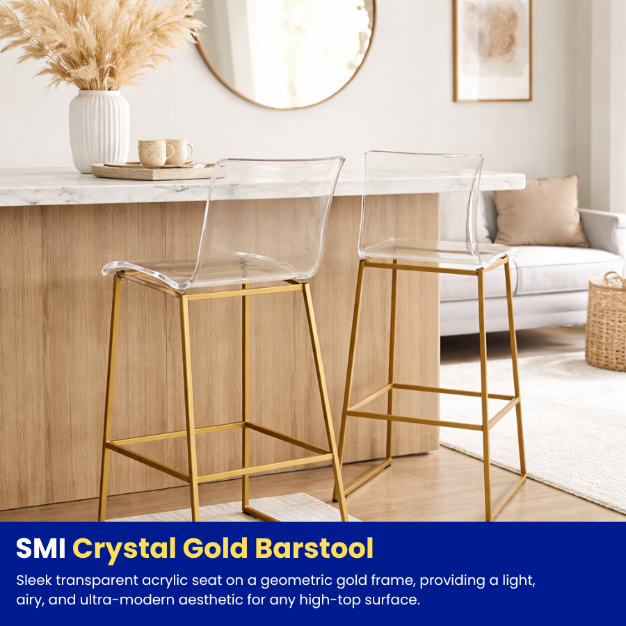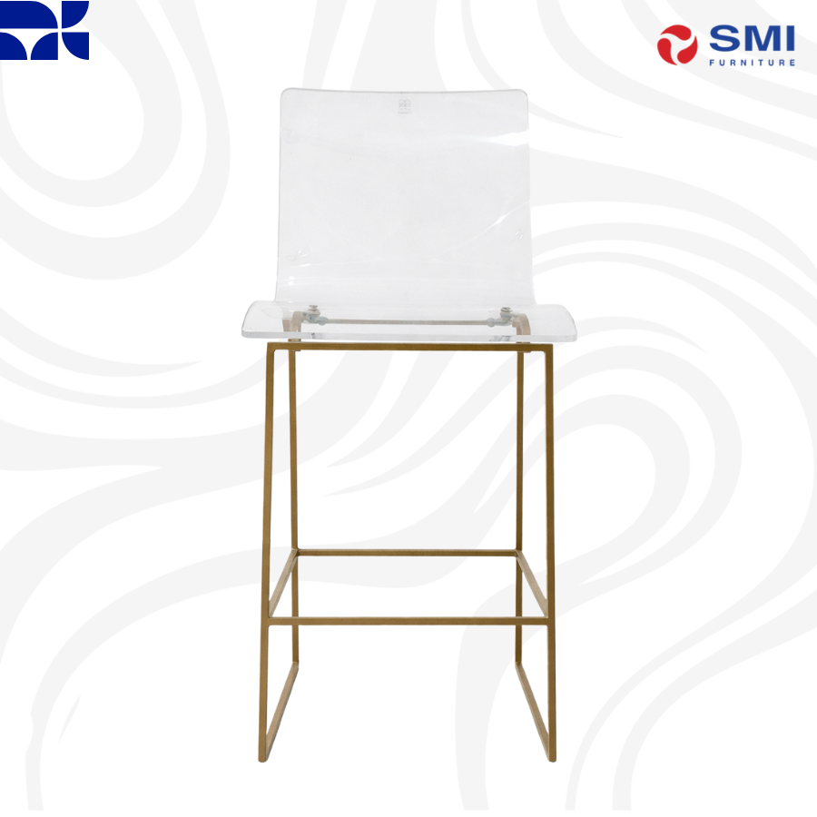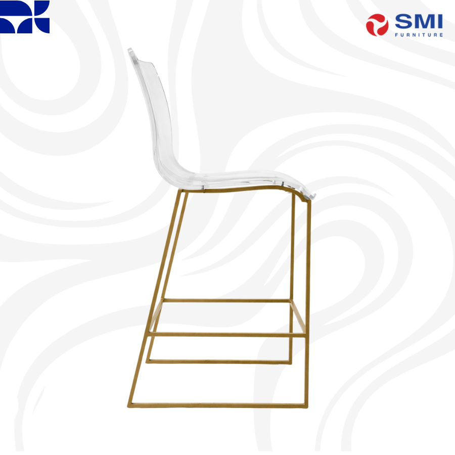 Sleek transparent acrylic seat on a geometric gold frame, providing a light, airy, and ultra-modern aesthetic for any high-top surface.