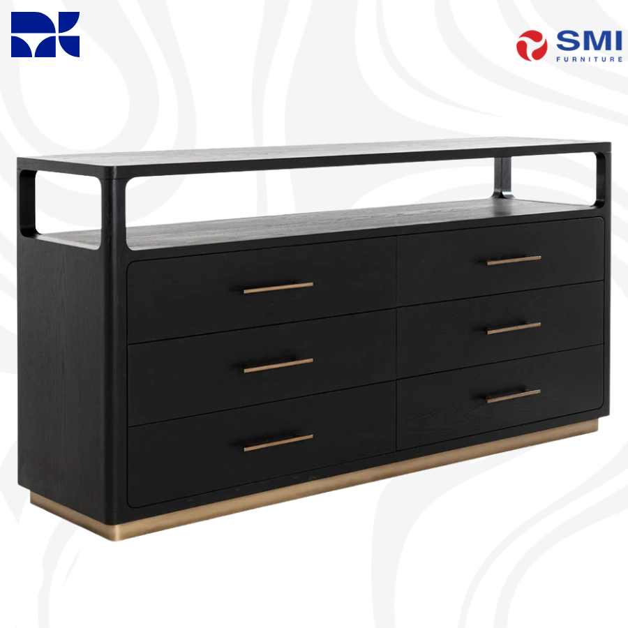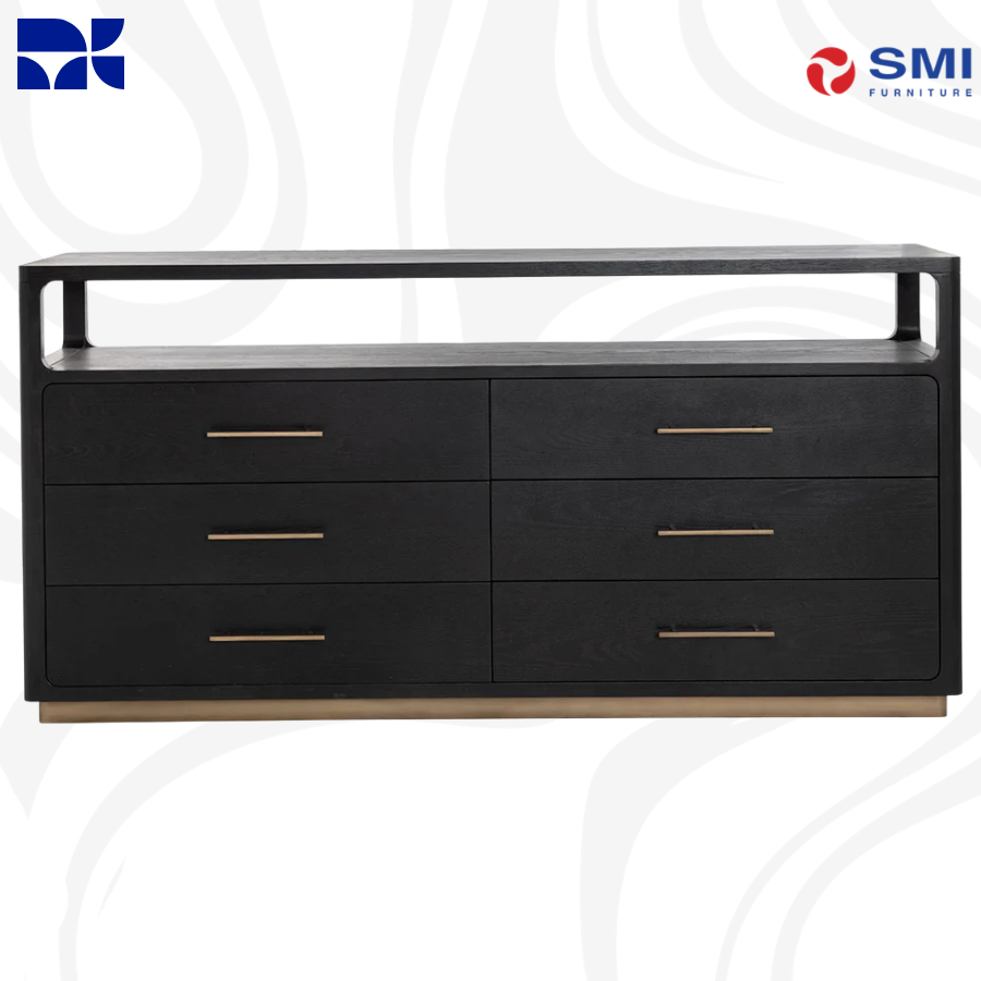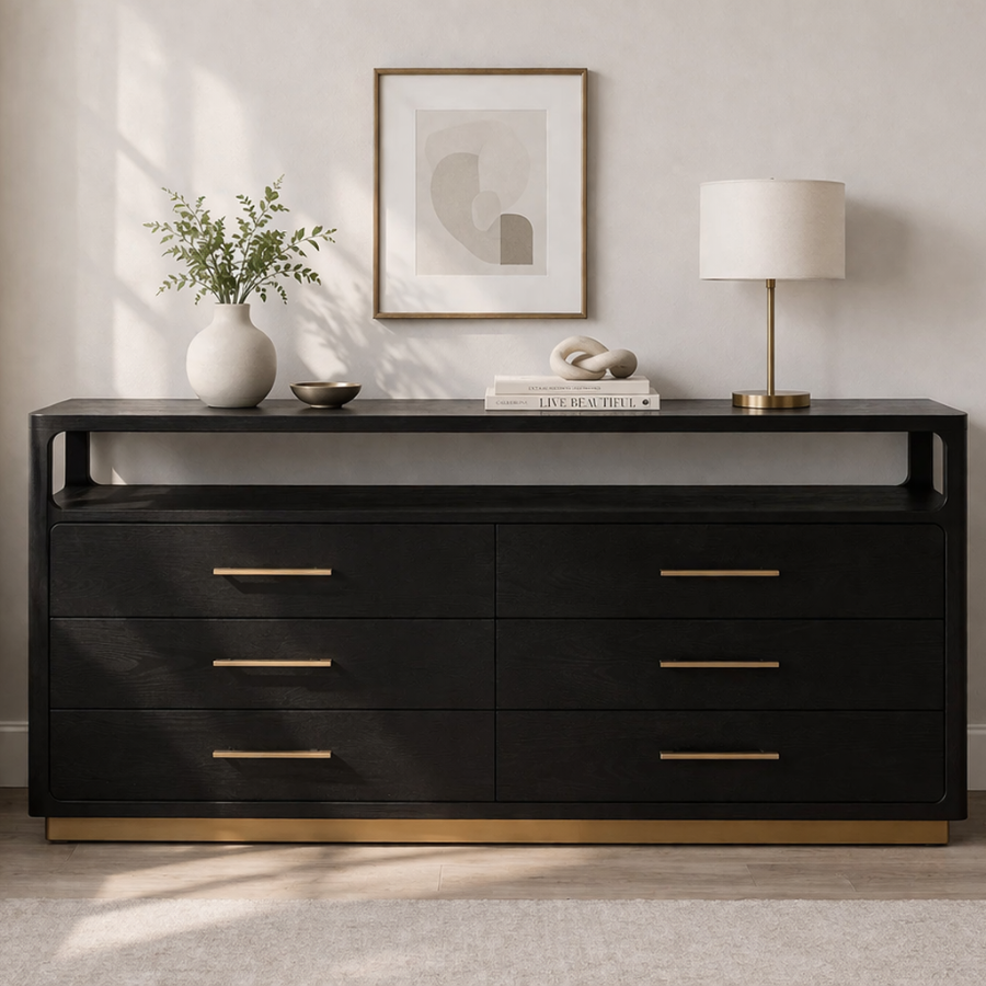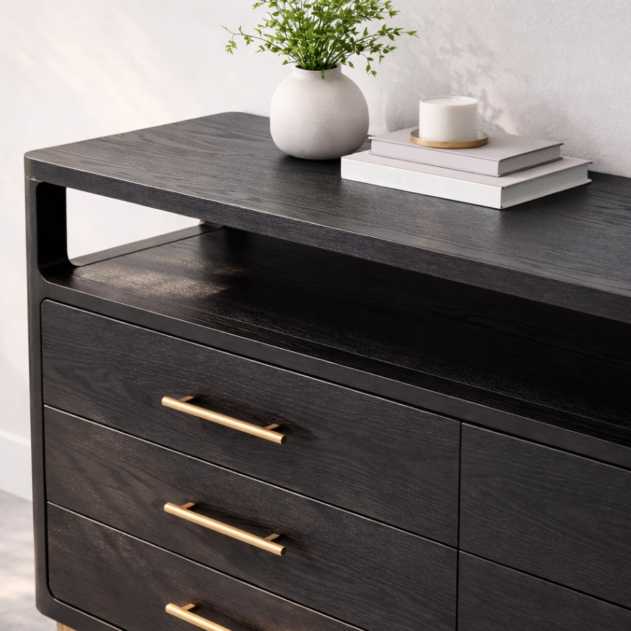 The Danette Dresser showcases a sleek, minimalist silhouette defined by clean lines and a bold black oak finish. Crafted from solid oak and oak veneer, it features warm brass hardware and a matching steel base for a sophisticated contrast. With soft-close drawers and an open top shelf for versatile styling, this substantial piece brings both modern elegance and functional storage to the bedroom.