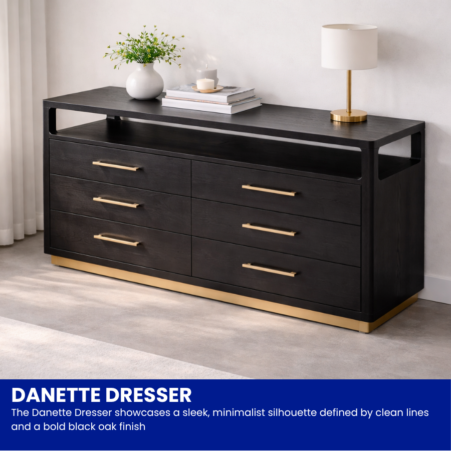 The Danette Dresser showcases a sleek, minimalist silhouette defined by clean lines and a bold black oak finish.