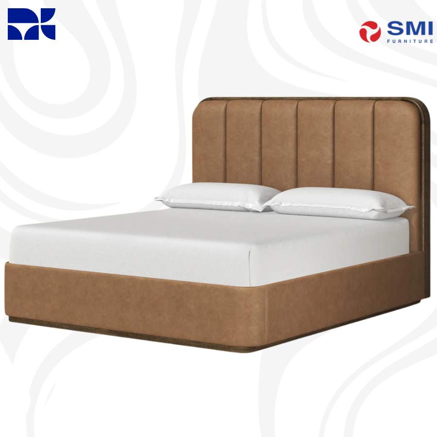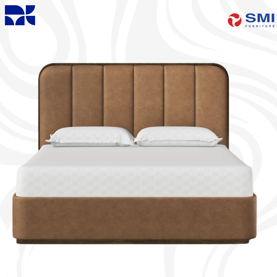 The Jamille Bed offers a plush, inviting aesthetic with its extra-thick, channel-tufted headboard upholstered in Milliken cognac faux leather. A solid oak frame in a brushed brown finish provides a sturdy, organic contrast, creating a sophisticated centerpiece for the bedroom. Built for durability, the high-performance faux leather is designed to withstand regular use while maintaining its rich, leather-like character.