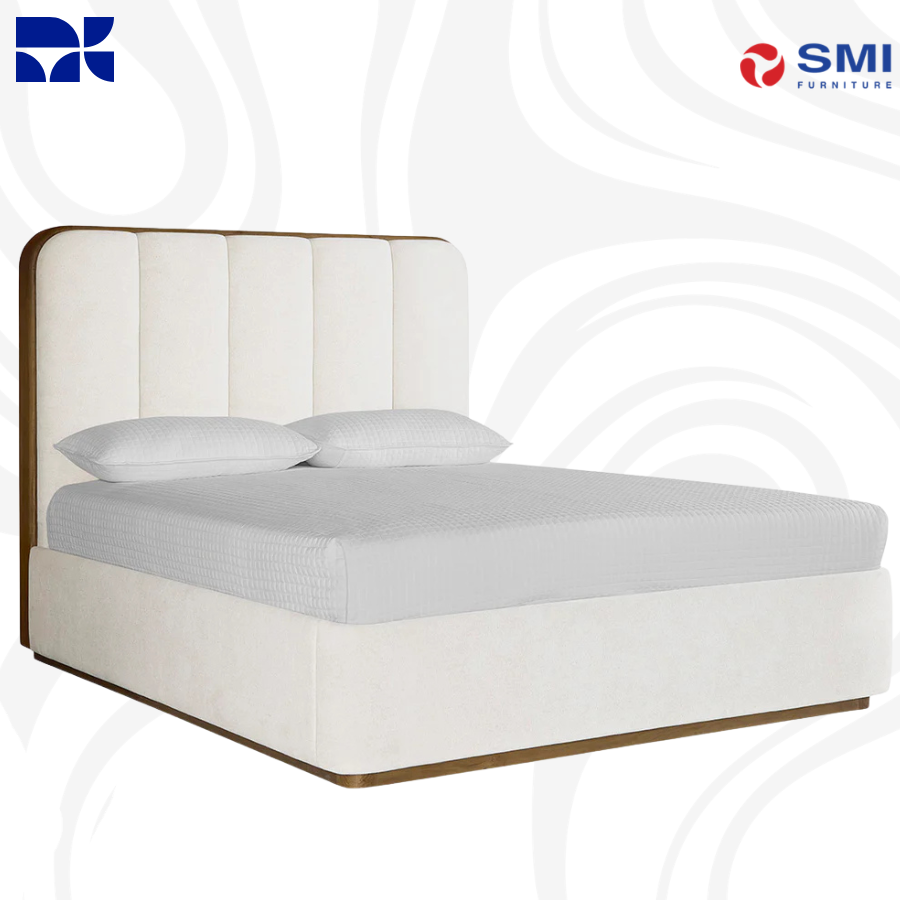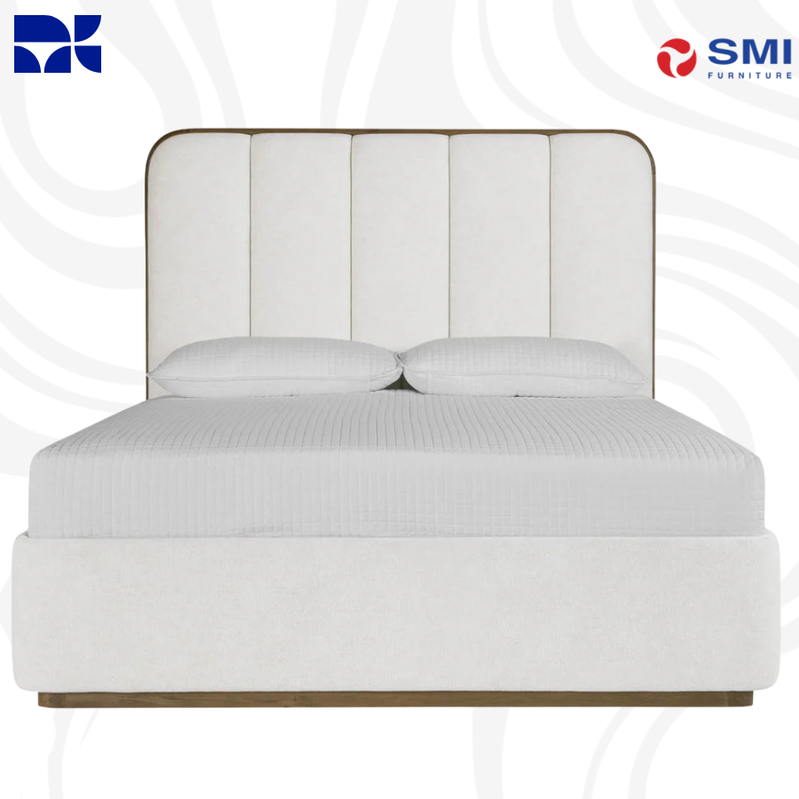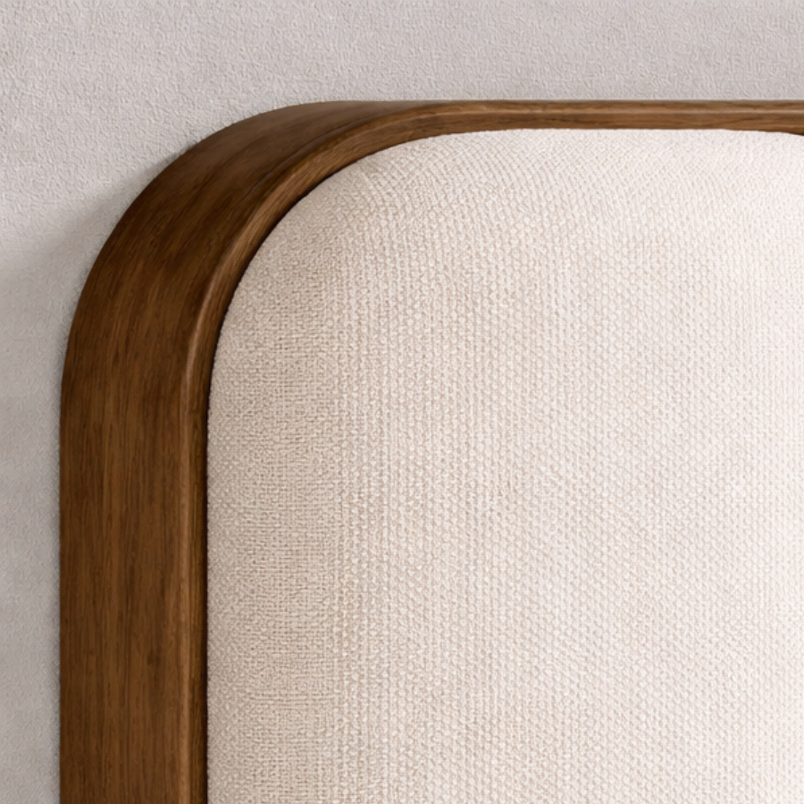 The Jamille Bed offers a plush, inviting aesthetic with its extra-thick, channel-tufted headboard upholstered in Milliken cognac faux leather. A solid oak frame in a brushed brown finish provides a sturdy, organic contrast, creating a sophisticated centerpiece for the bedroom. Built for durability, the high-performance faux leather is designed to withstand regular use while maintaining its rich, leather-like character.
