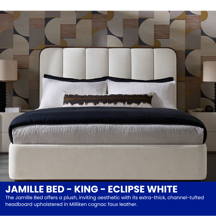 The Jamille Bed offers a plush, inviting aesthetic with its extra-thick, channel-tufted headboard upholstered in Milliken cognac faux leather.