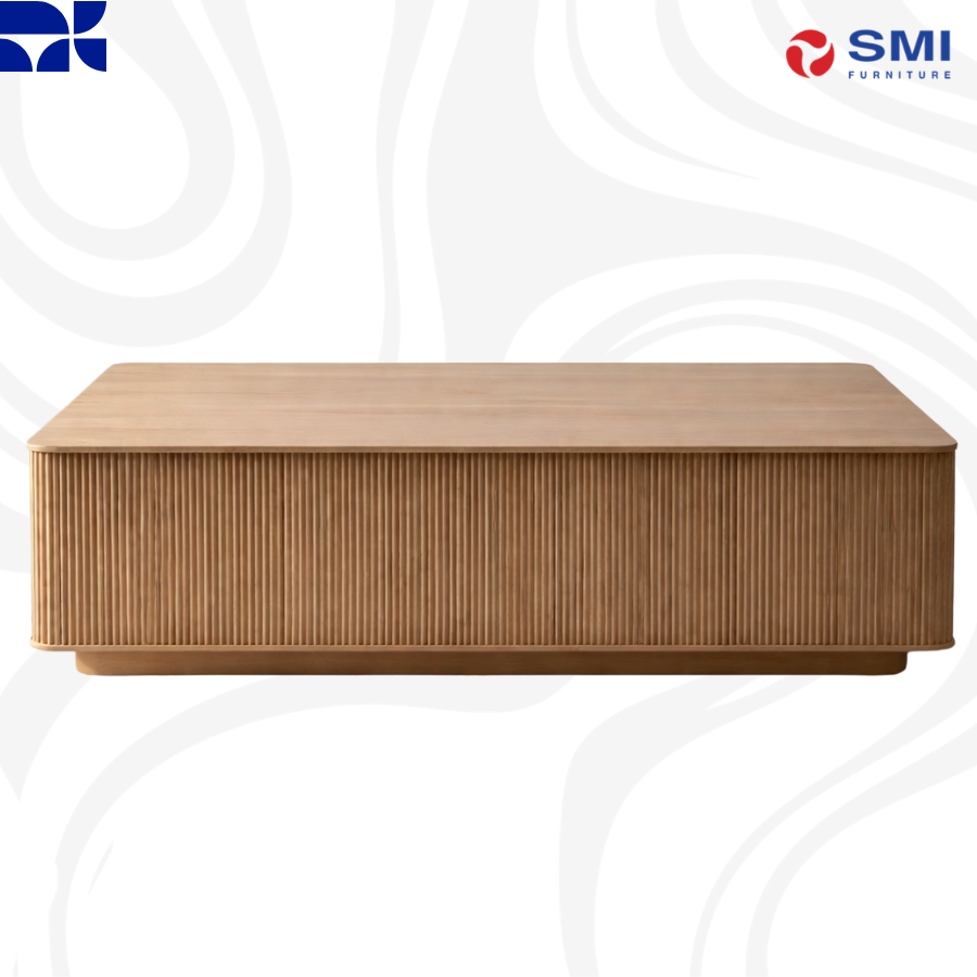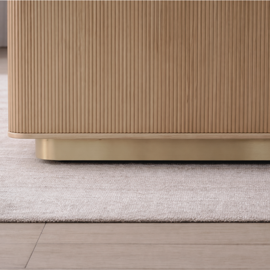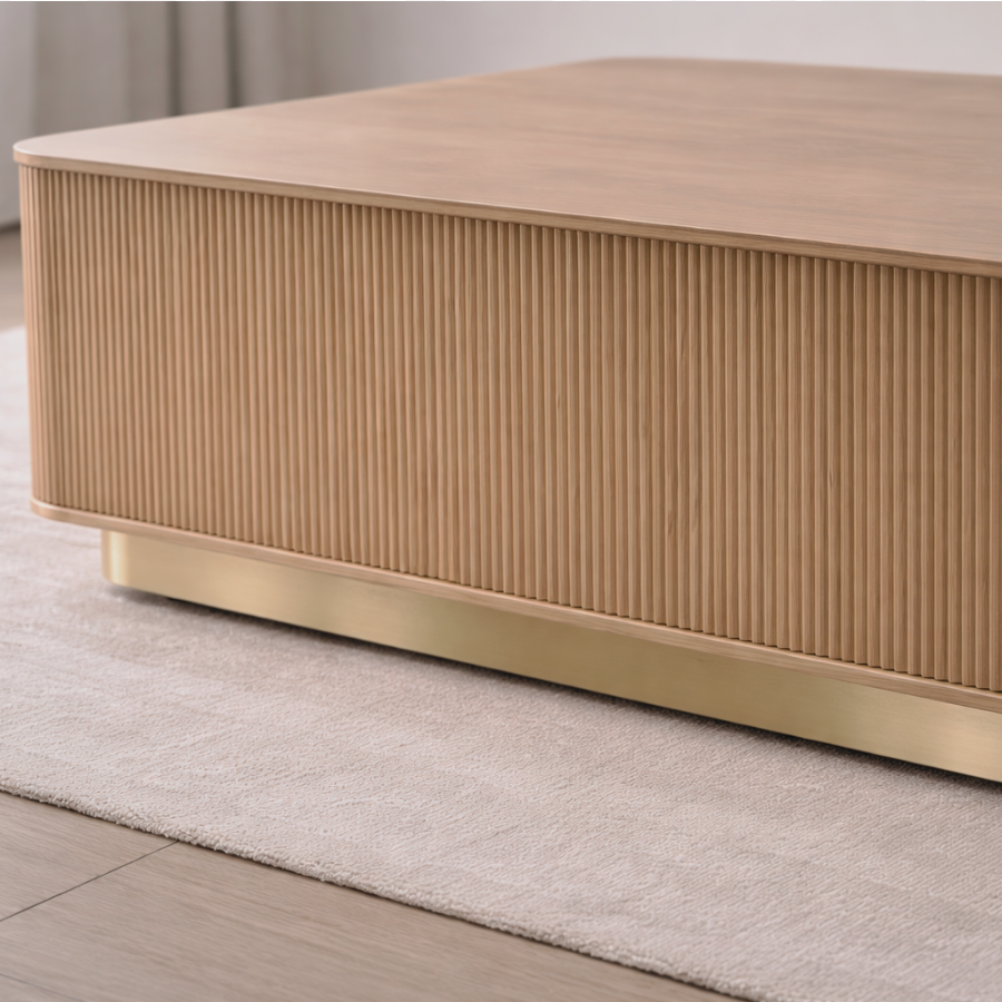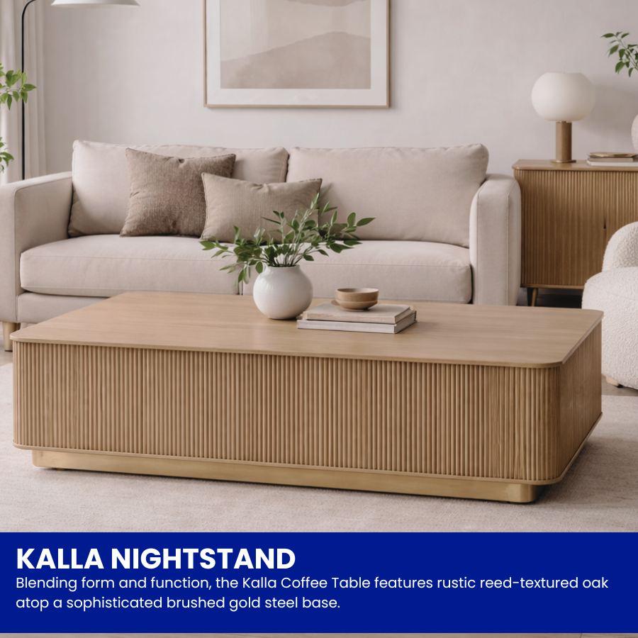 The Kalla Coffee Table brings form and function to life. Crafted with rustic oak wood and oak veneer with vertical reeding. A brushed gold steel base finishes the look.