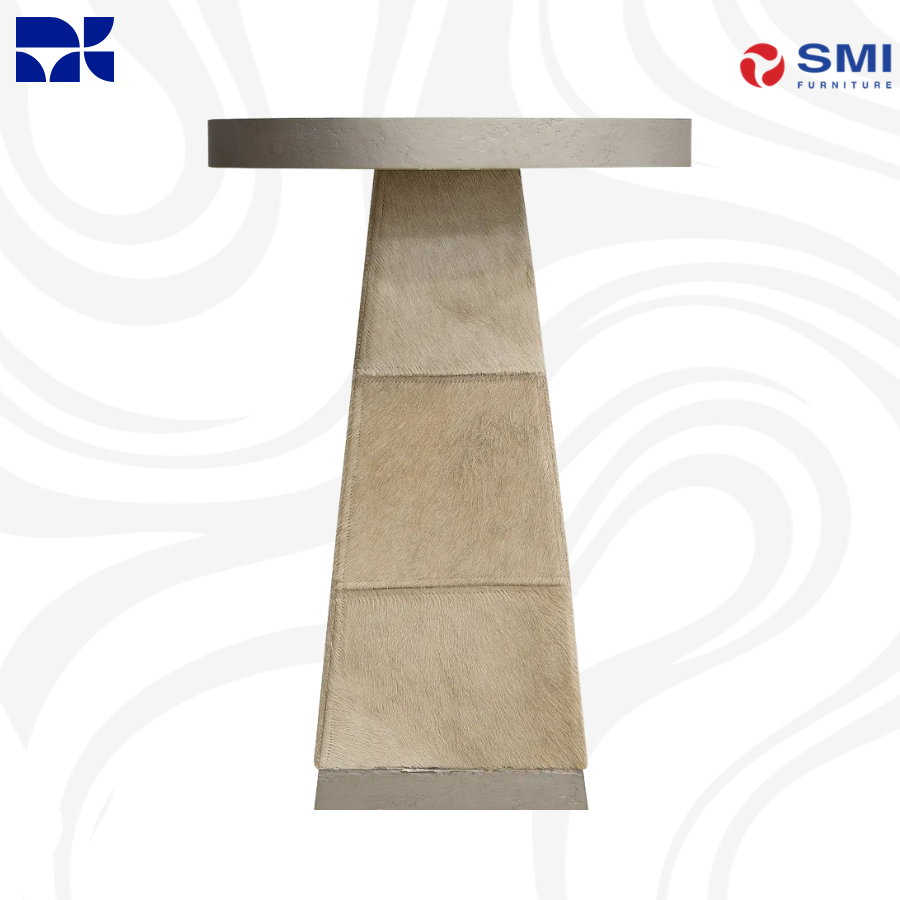 The Mélange Holy Cow Spot Table is an artistic blend of natural luxury and bold character, featuring a honed travertine top and a unique hair-on-hide leather base. Silver metal bands accent the transitions between materials, creating a striking piece that adds organic texture and visual interest to any space. With its compact circular footprint, it serves as a sophisticated statement accent for transitional interiors.