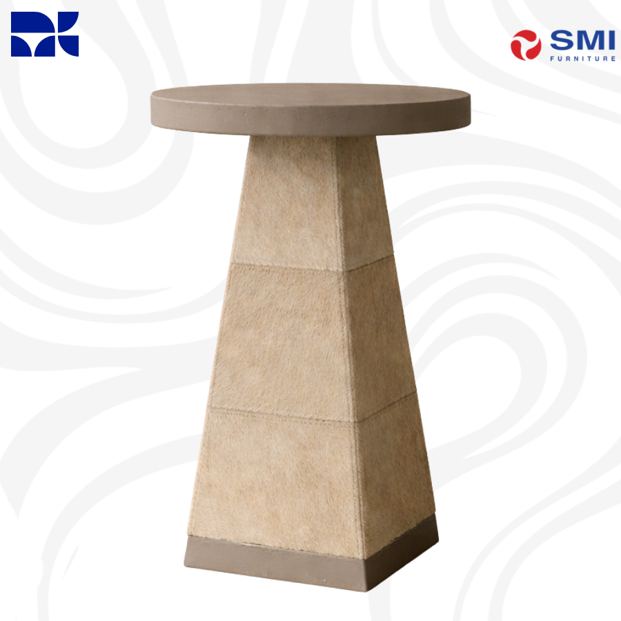 Features: Inset stone top, decorative metal banding, weighted base for stability