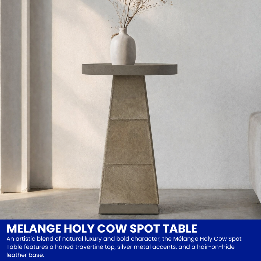 An artistic blend of natural luxury and bold character, the Mélange Holy Cow Spot Table features a honed travertine top, silver metal accents, and a hair-on-hide leather base.