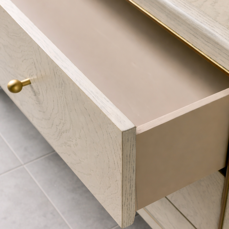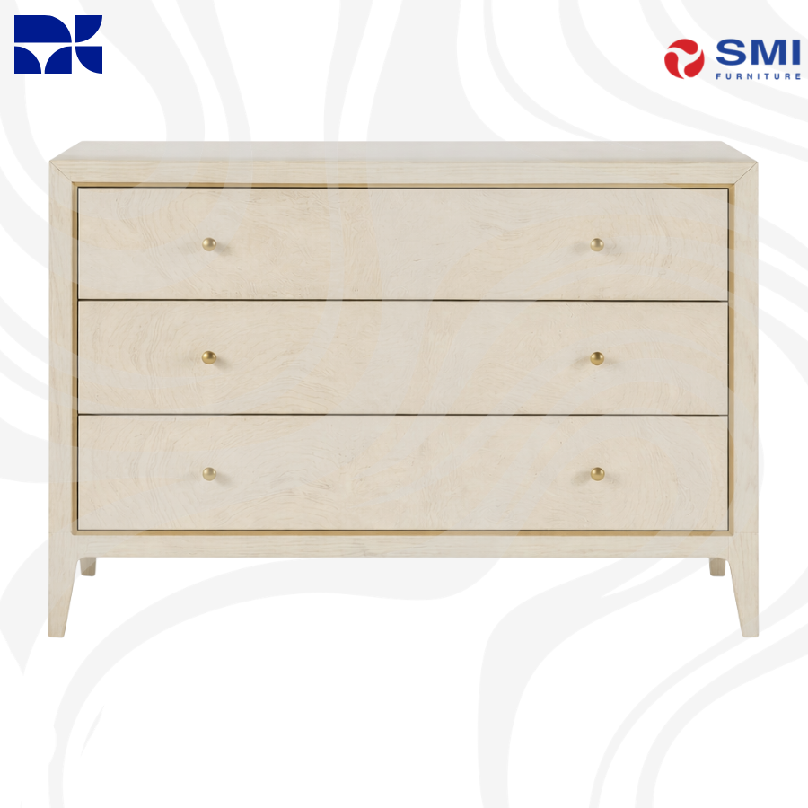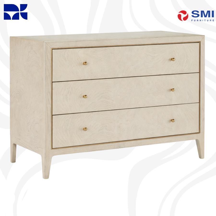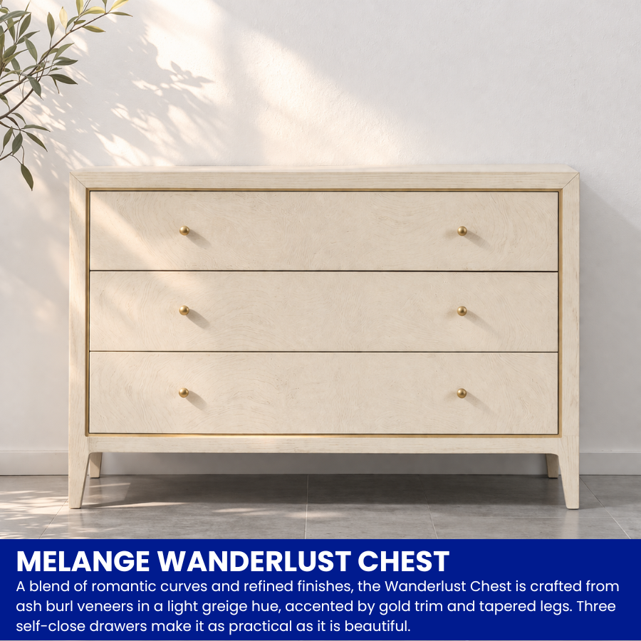 The Wanderlust Chest combines romantic curves with refined detailing, showcasing the natural beauty of ash burl veneers in a light greige hue. Elevated by elegant gold trim and sleek tapered legs, this piece offers a sophisticated storage solution. With three self-closing drawers, it seamlessly blends high-end artistry with everyday functionality.