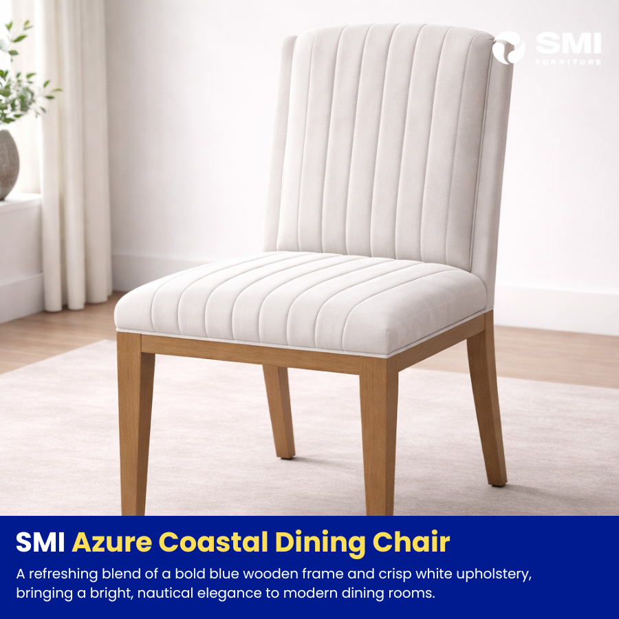 A refreshing blend of a bold blue wooden frame and crisp white upholstery, bringing a bright, nautical elegance to modern dining rooms.