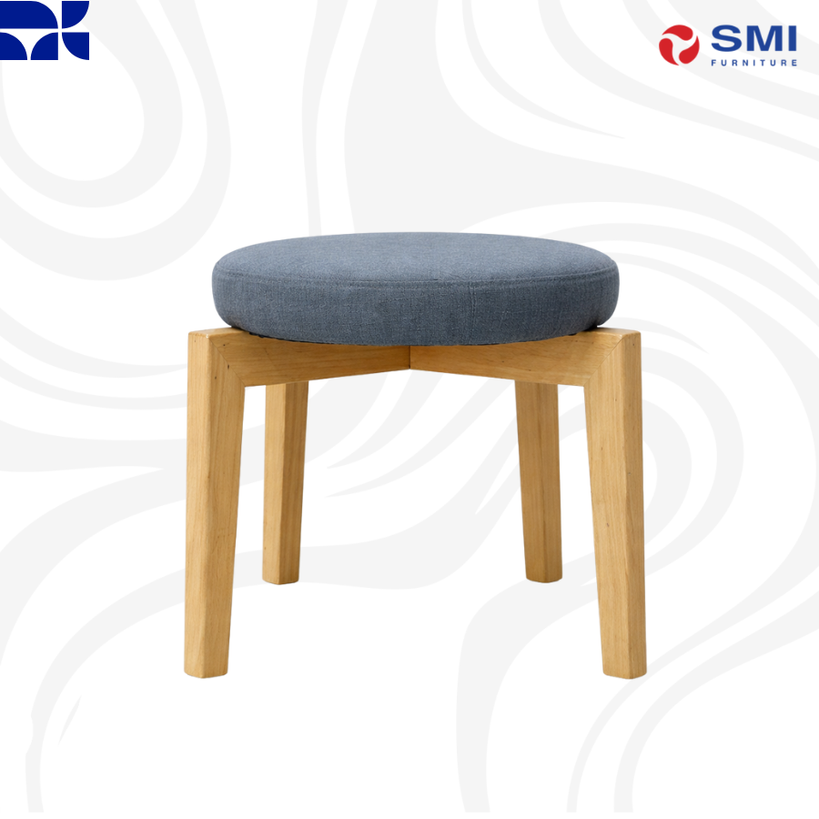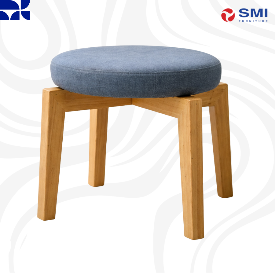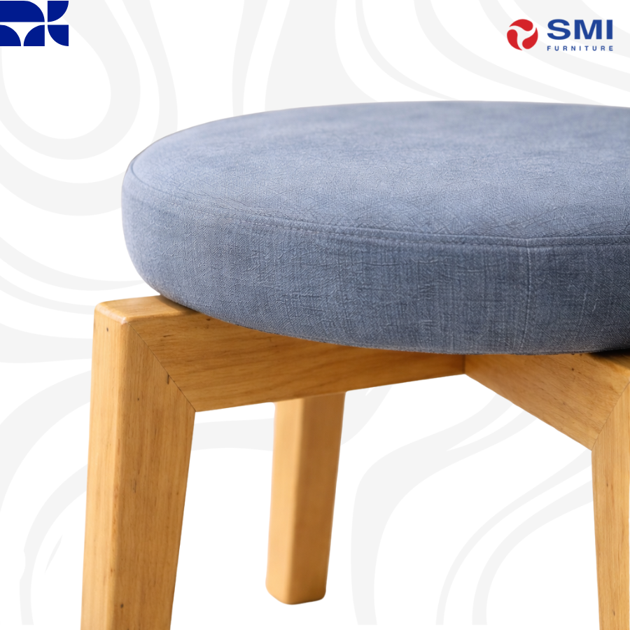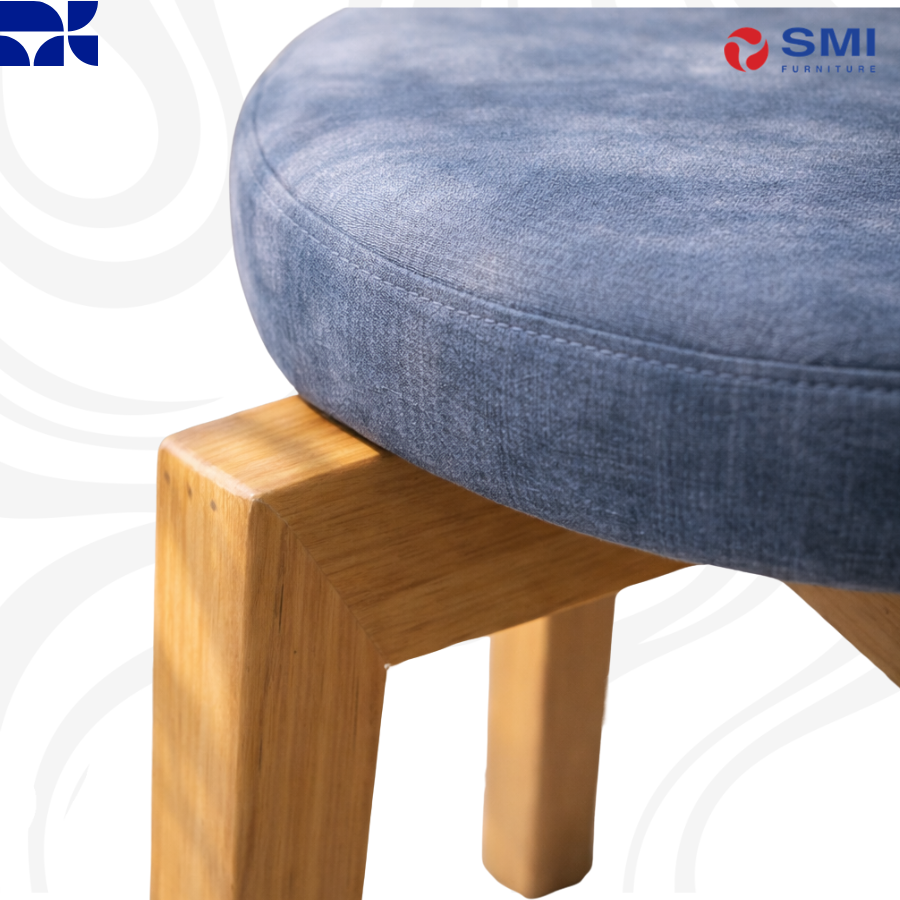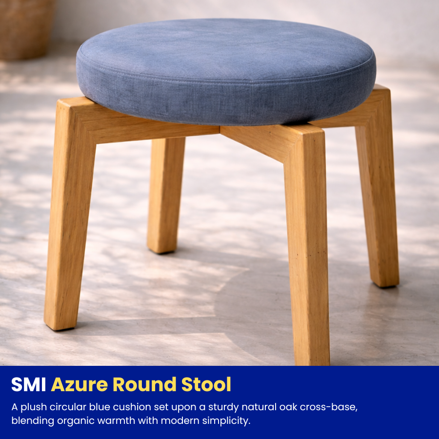 A plush circular blue cushion set upon a sturdy natural oak cross-base, blending organic warmth with modern simplicity.