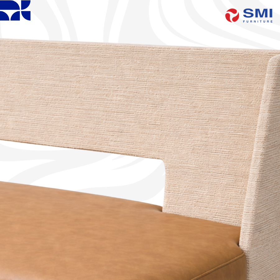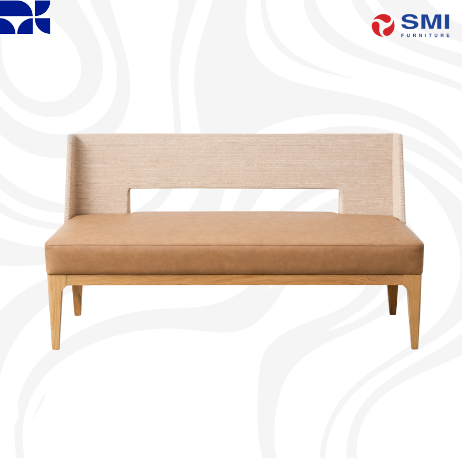 A sophisticated long-seat bench featuring a tan leather base and a uniquely cutout woven backrest, supported by an elegant oak frame.