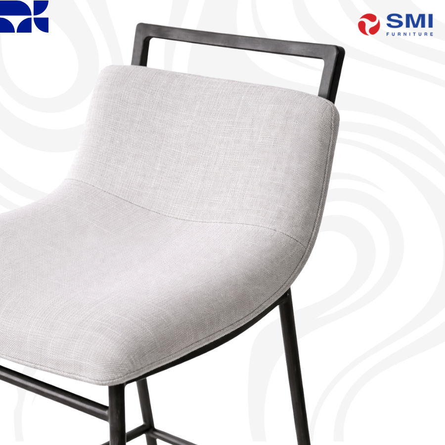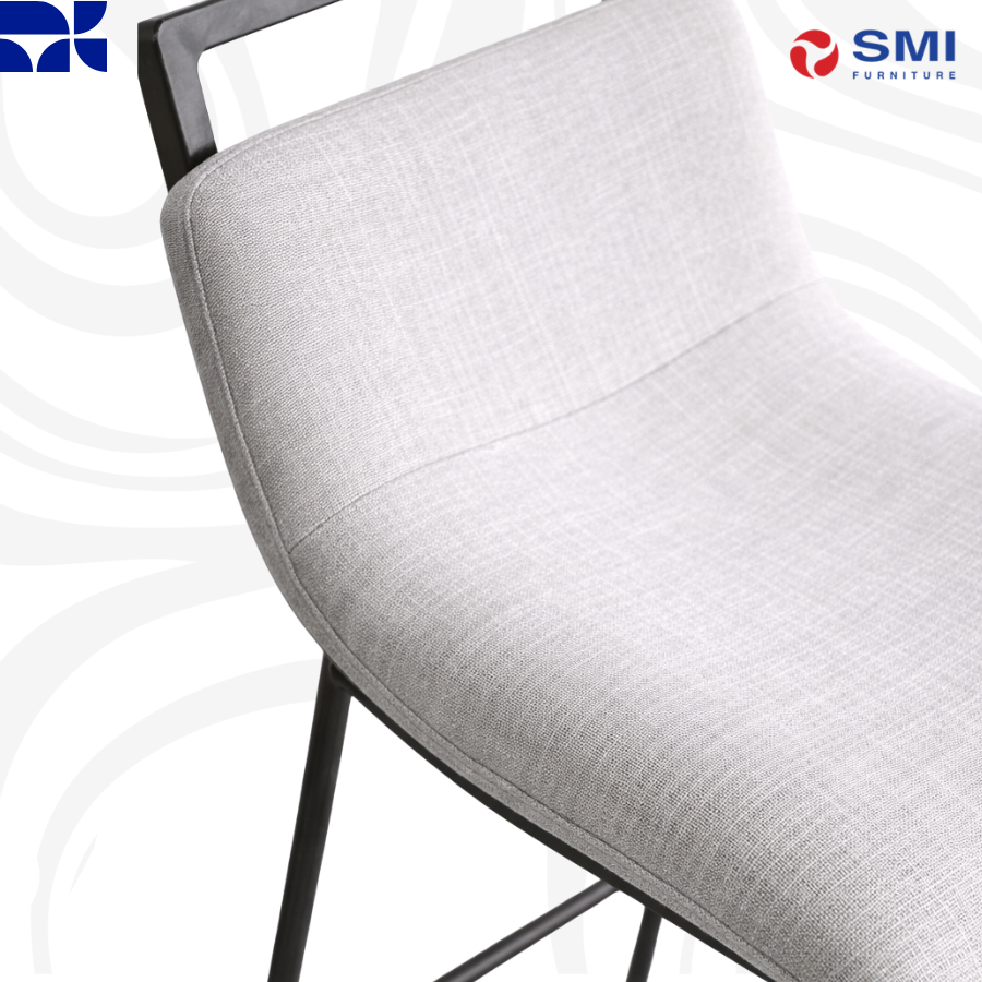 A sleek, high-profile barstool featuring a slim charcoal frame and soft light-grey upholstery, combining Nordic simplicity with modern comfort.