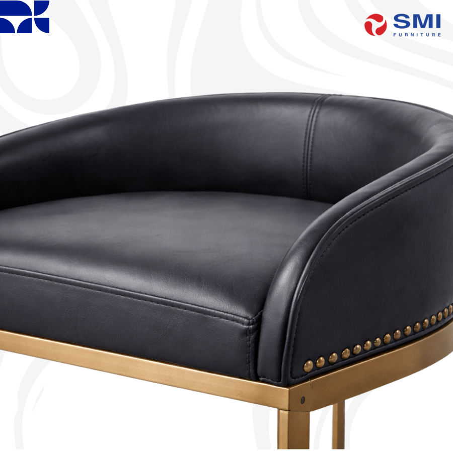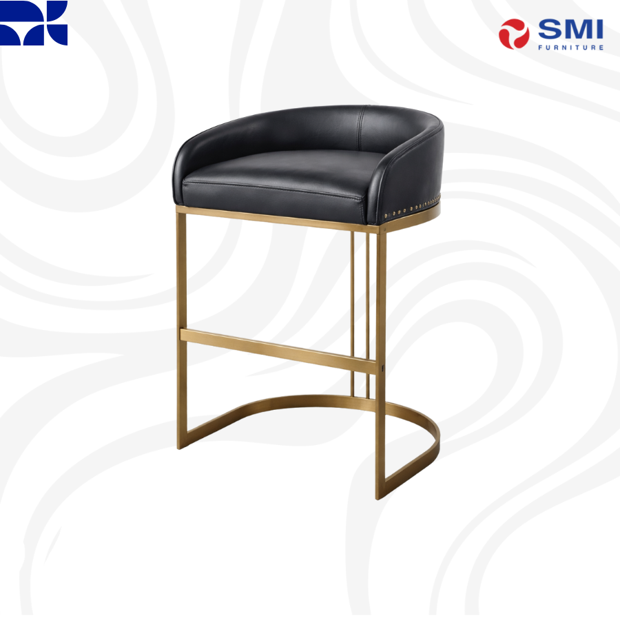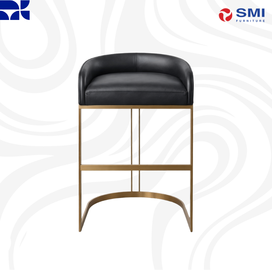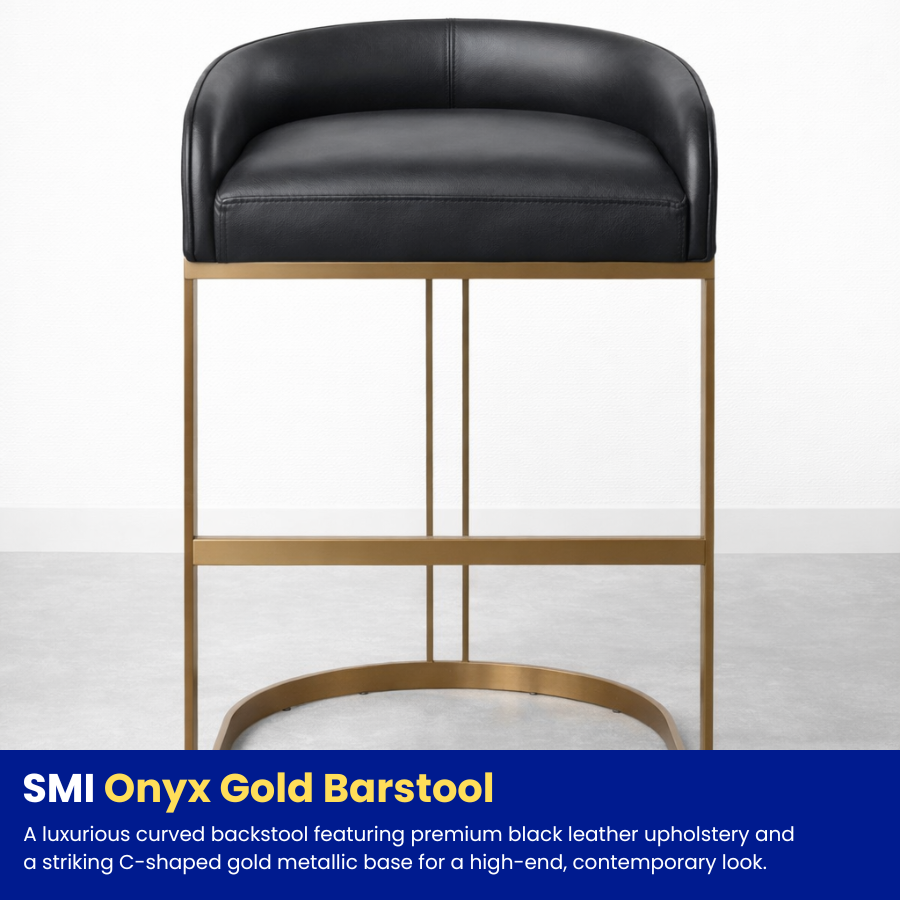 A luxurious curved backstool featuring premium black leather upholstery and a striking C-shaped gold metallic base for a high-end, contemporary look.