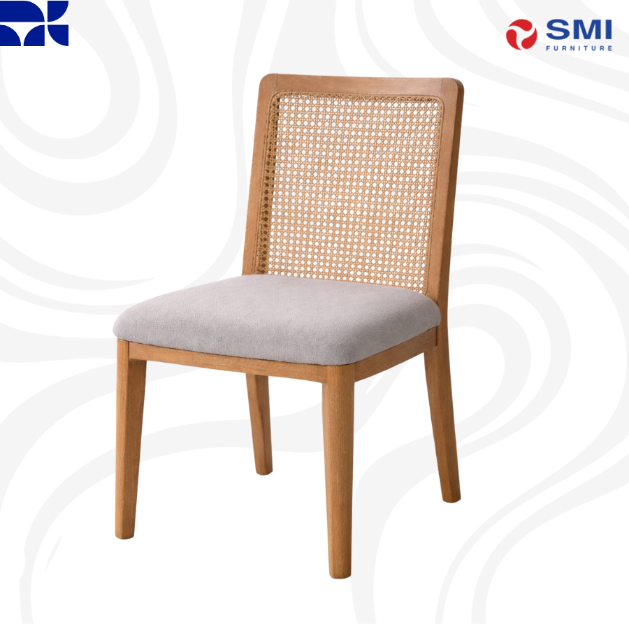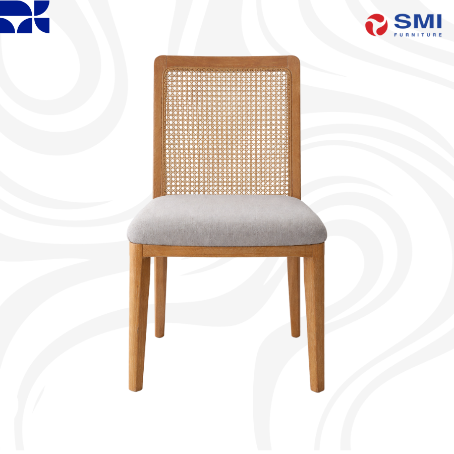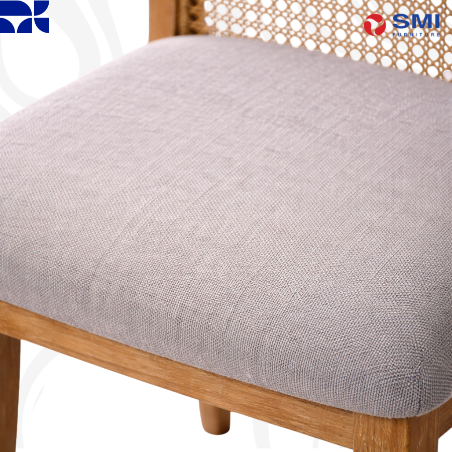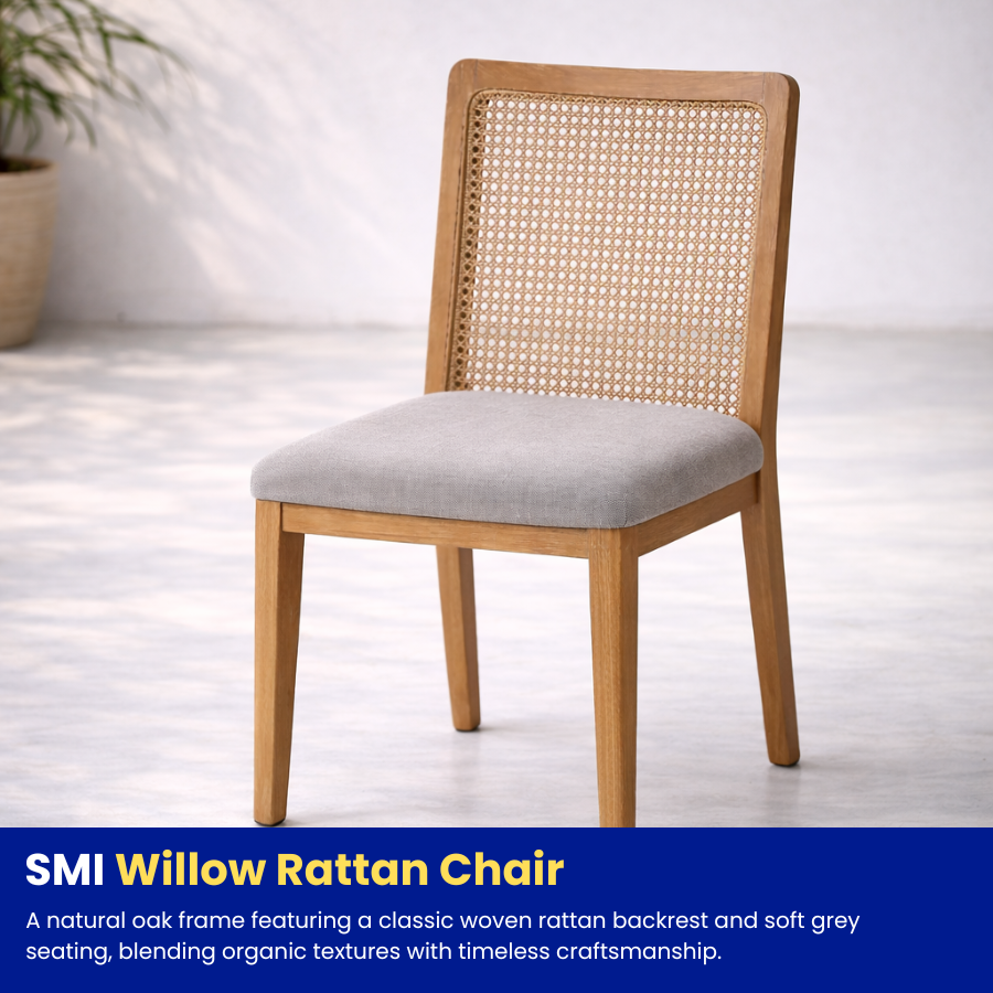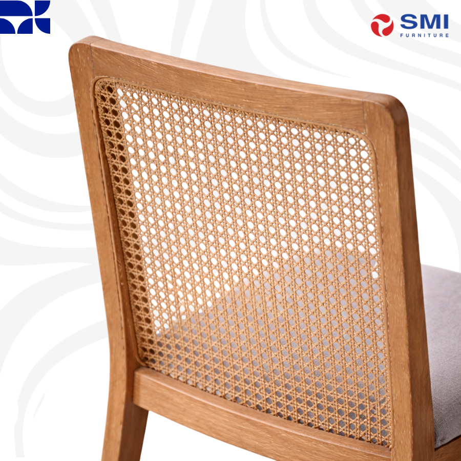 A natural oak frame featuring a classic woven rattan backrest and soft grey seating, blending organic textures with timeless craftsmanship.