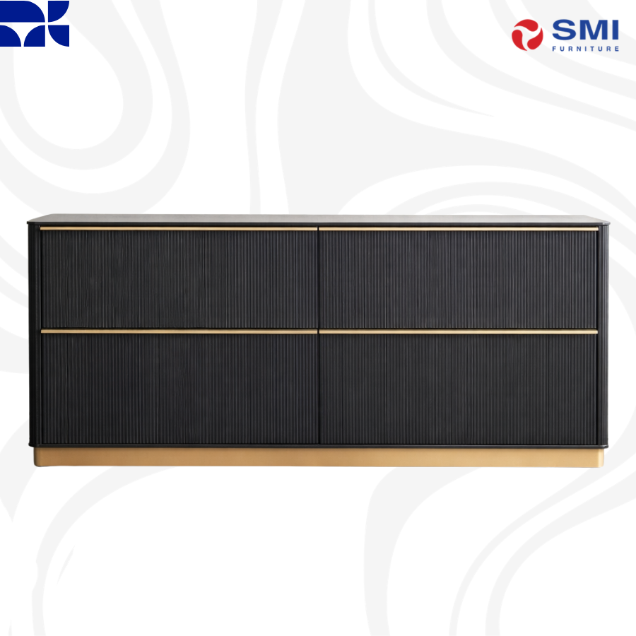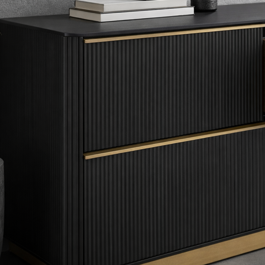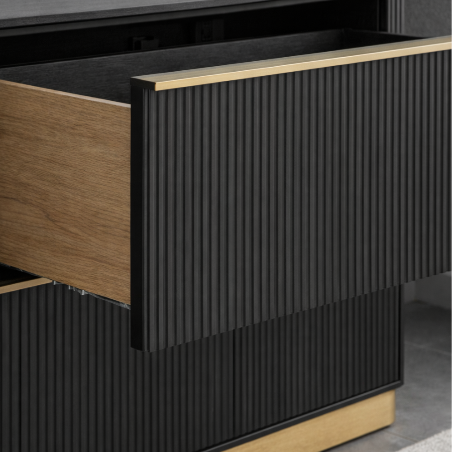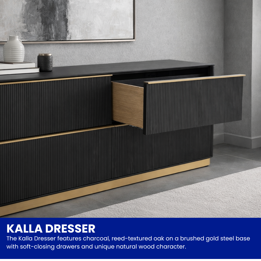 The Kalla Dresser combines form and function, featuring a charcoal-finished rustic oak veneer with elegant vertical reeding. Supported by a brushed gold steel base, this 72-inch piece includes soft-closing drawers and an anti-tipping kit. As an organic material, the wood displays unique knots, grains, and textures that ensure every dresser is one of a kind.